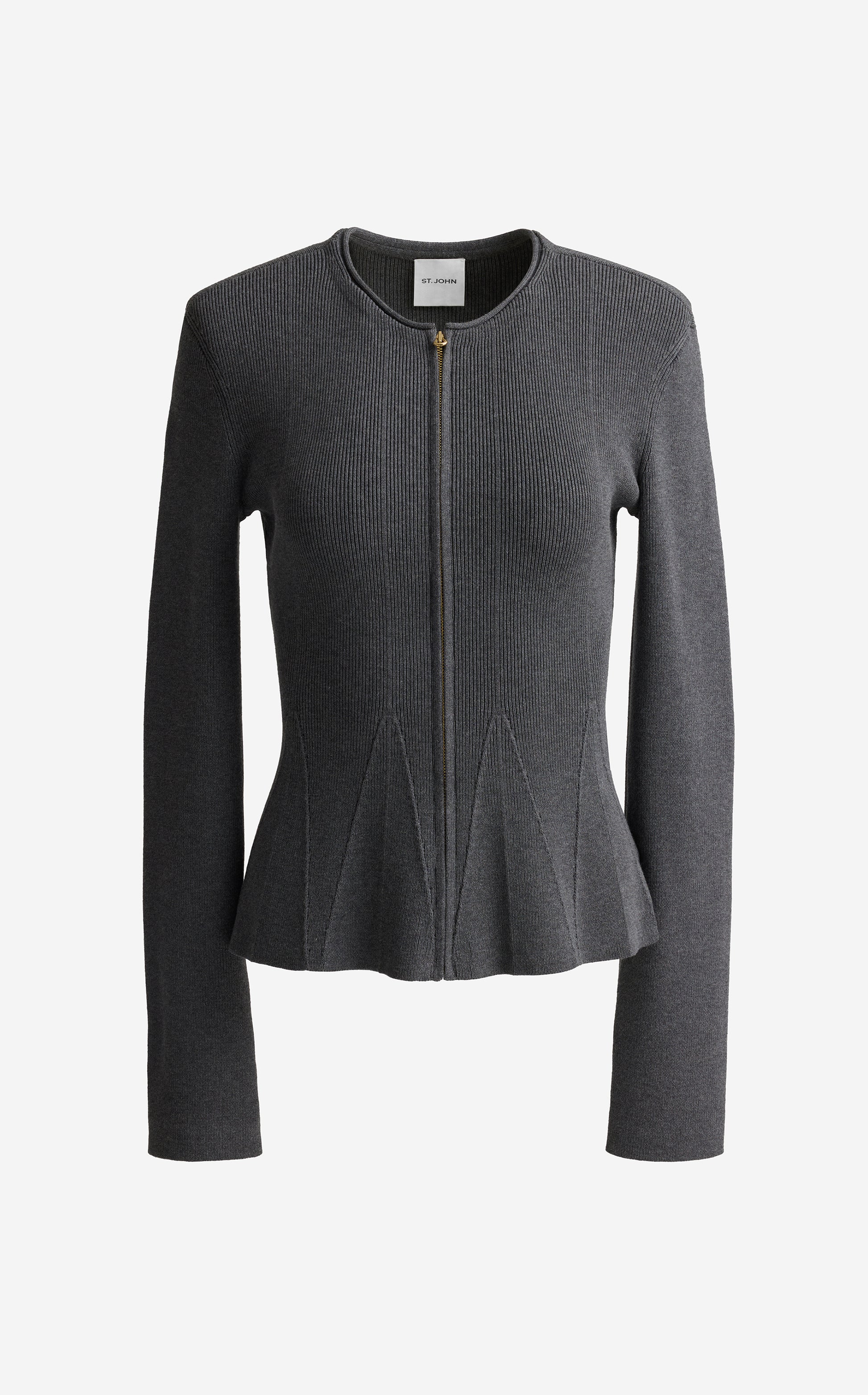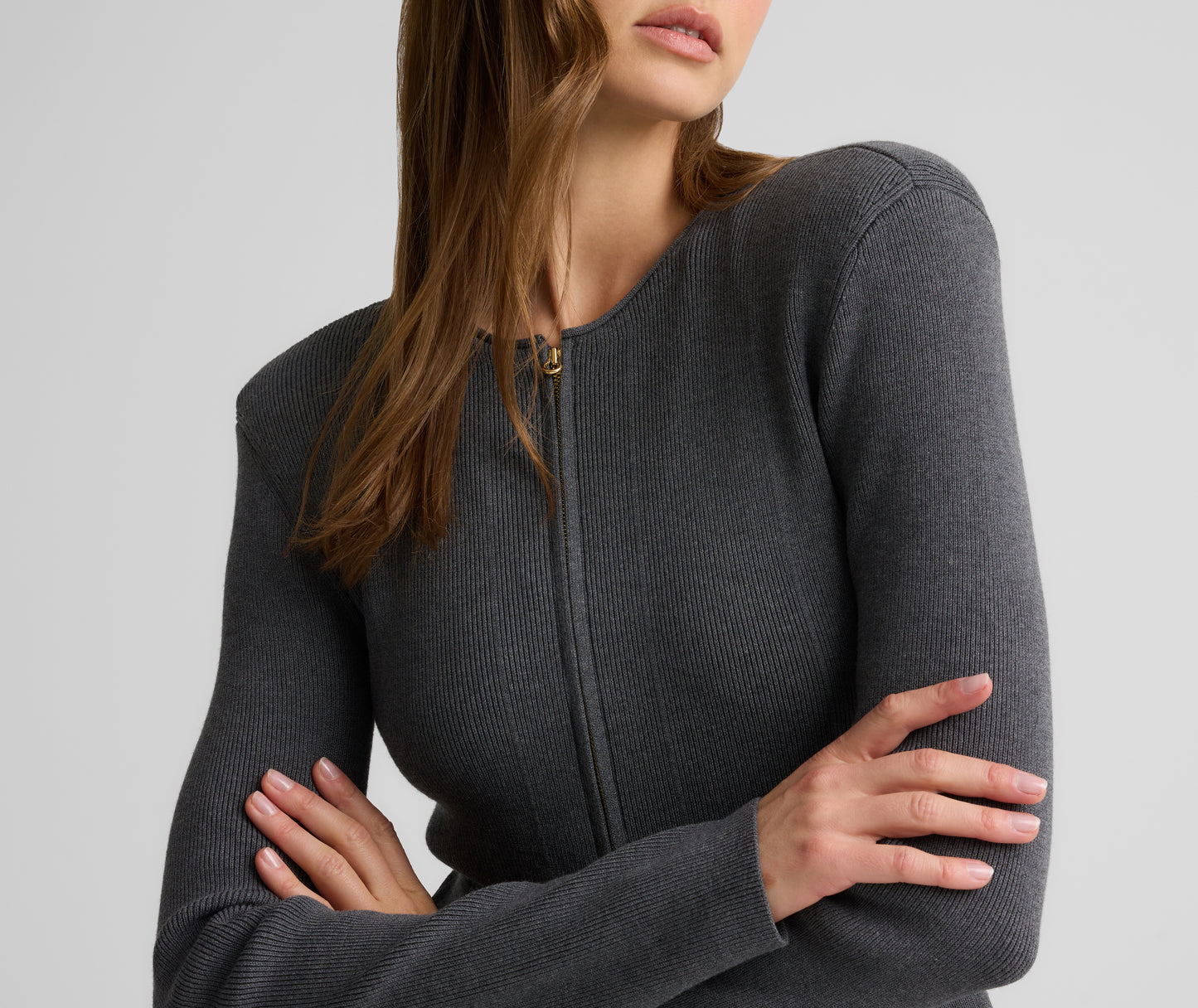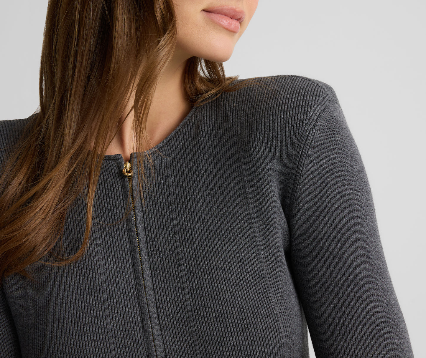 The Maura redefines power dressing by perfectly balancing softness and strength. With its structured shoulders and godet details, this zip-up jacket presents a defined shape while the delicate ribbed knit offers a flexible, comfortable fit. Layer over the Velma Dress for a bold and refreshing alternative to traditional suiting.