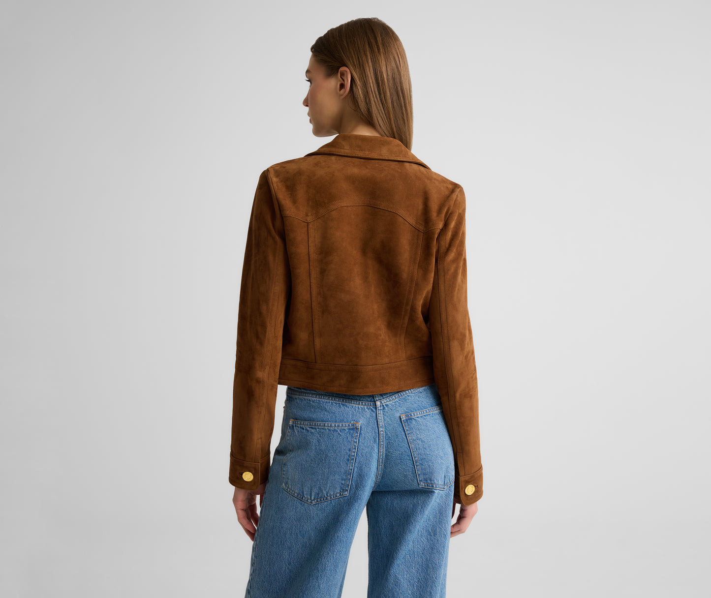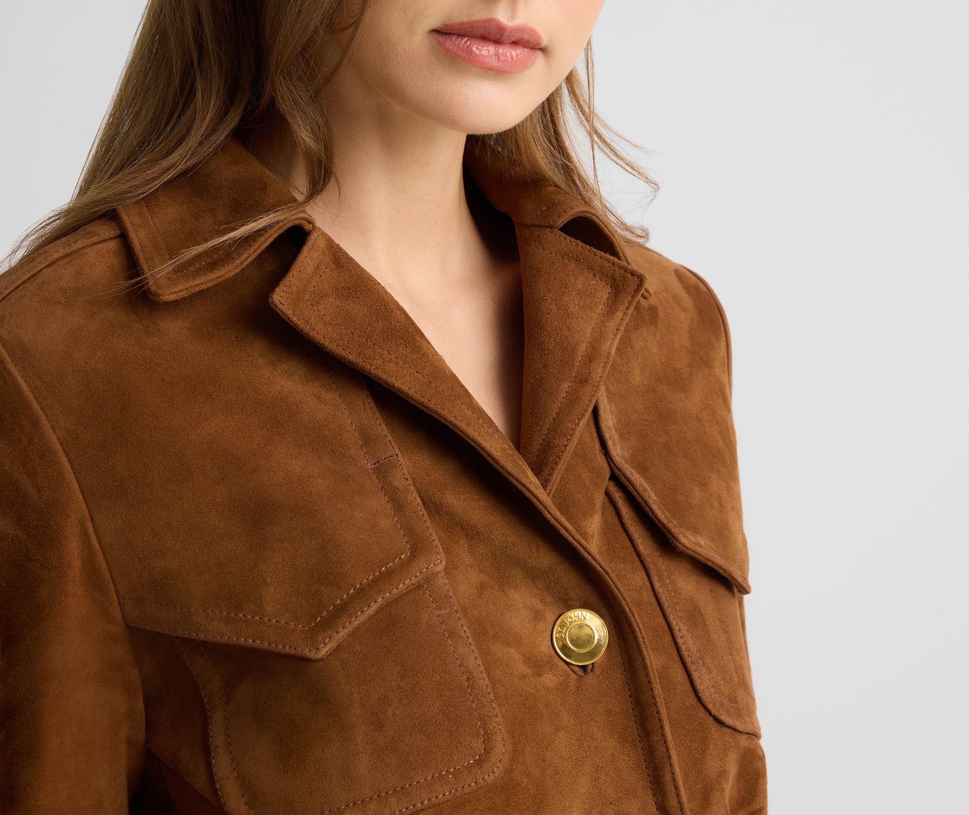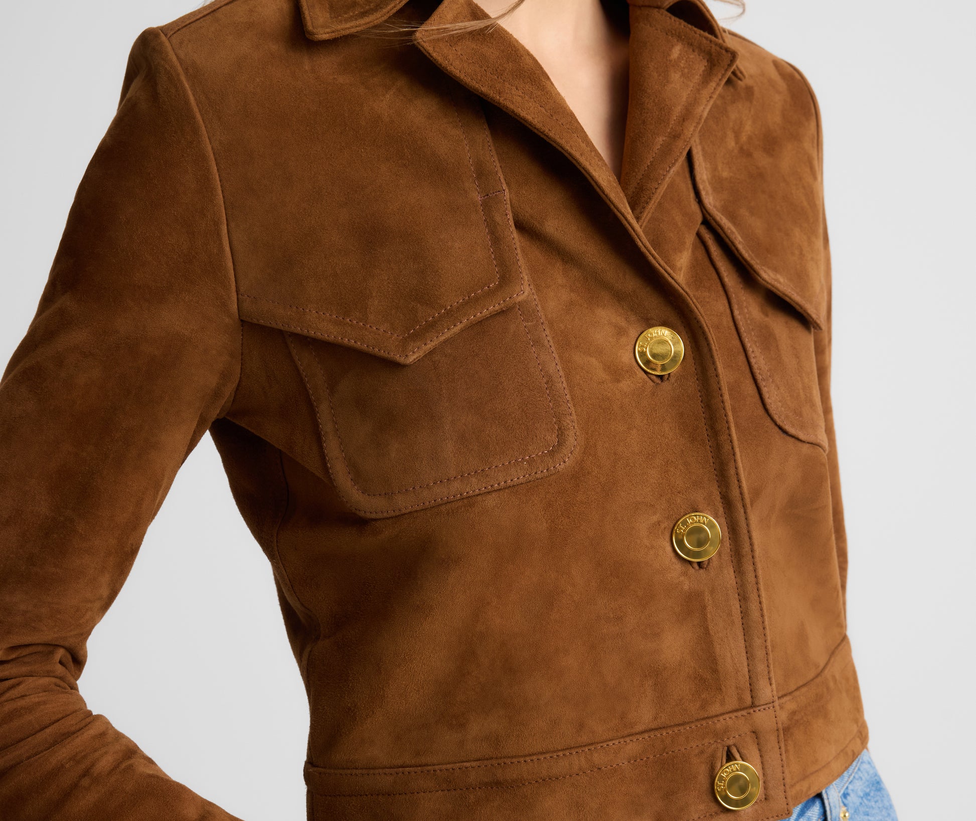 Tailored to perfection and crafted with luxury in mind, the Laurel refines the classic suede jacket through elevated details like high shine gold buttons and decorative flap pockets. And with its fitted, slightly cropped silhouette, it adds a layer of effortless polish to casual and dressed-up ensembles alike.