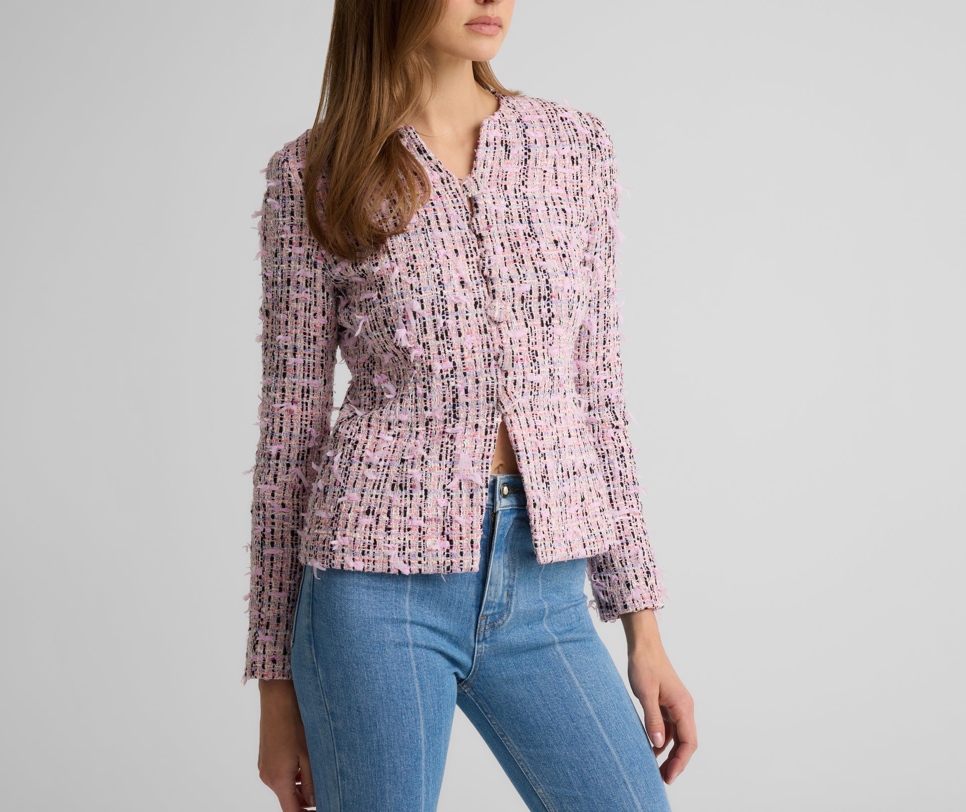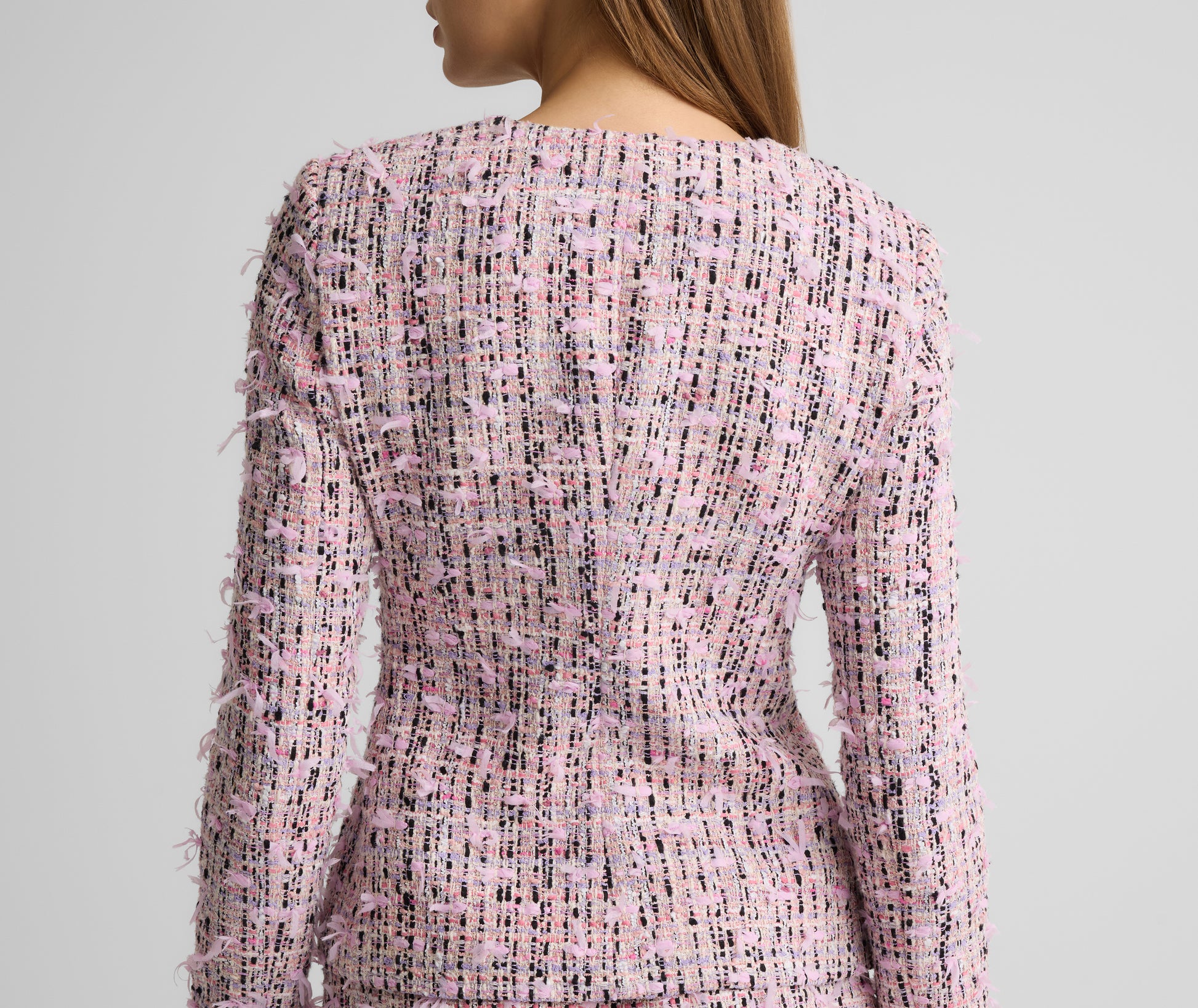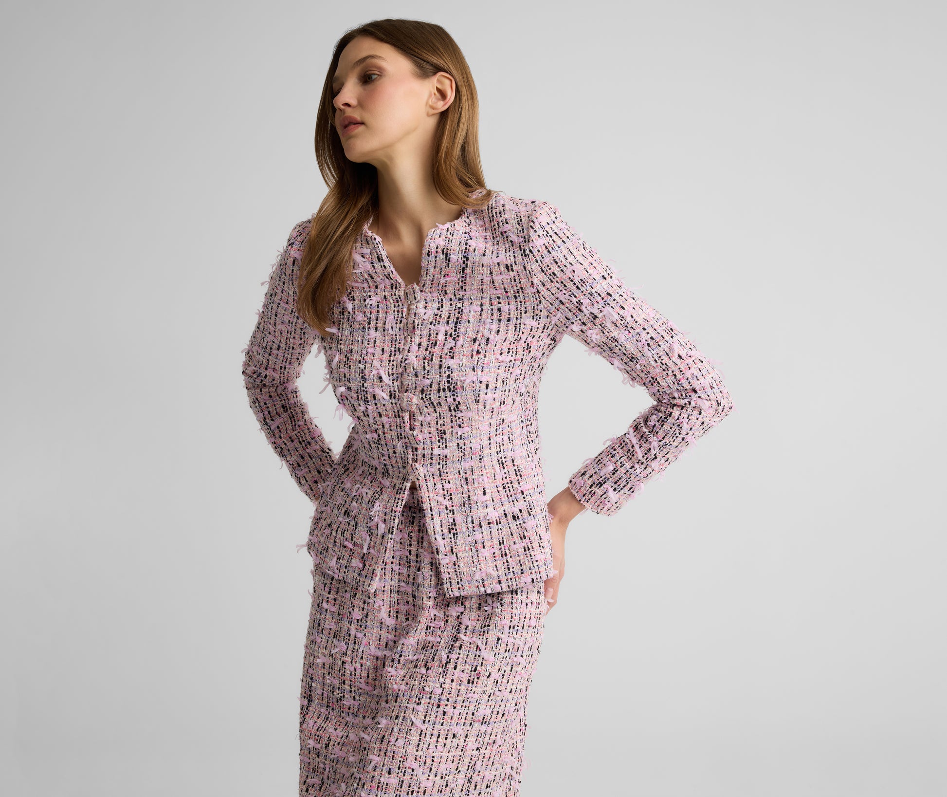 From its fluttery finish to its fabric covered buttons, the Anastasia features thoughtful details from every angle. Our uniquely textured Ivy Tweed gives this fitted, figure flattering jacket its showstopper status—whether worn off-duty with denim or with its coordinating Arielle Skirt for a polished yet whimsical set at the office or a lavish luncheon.