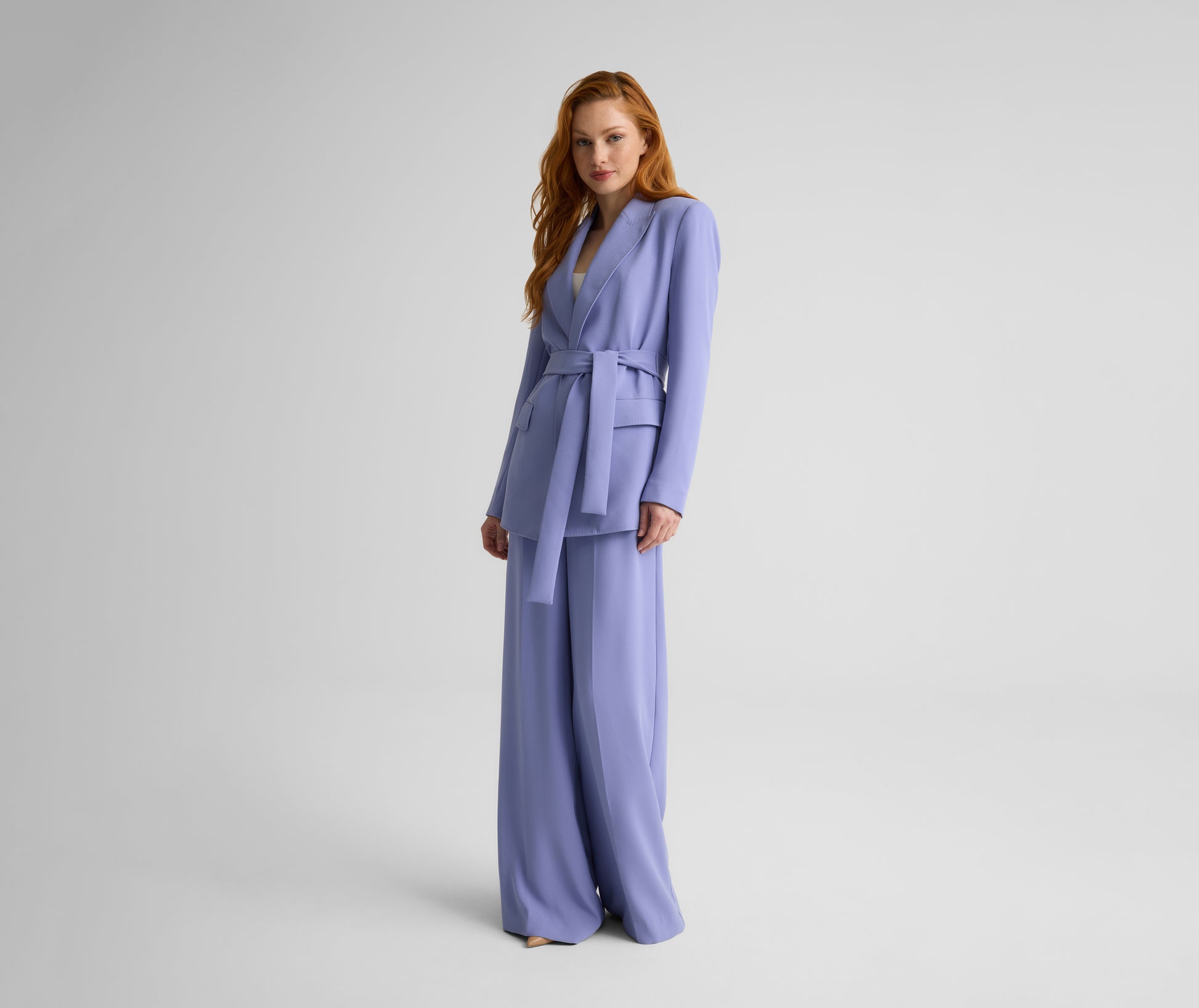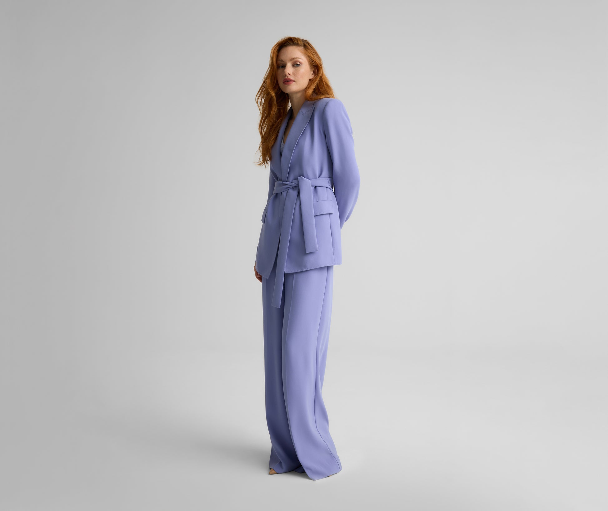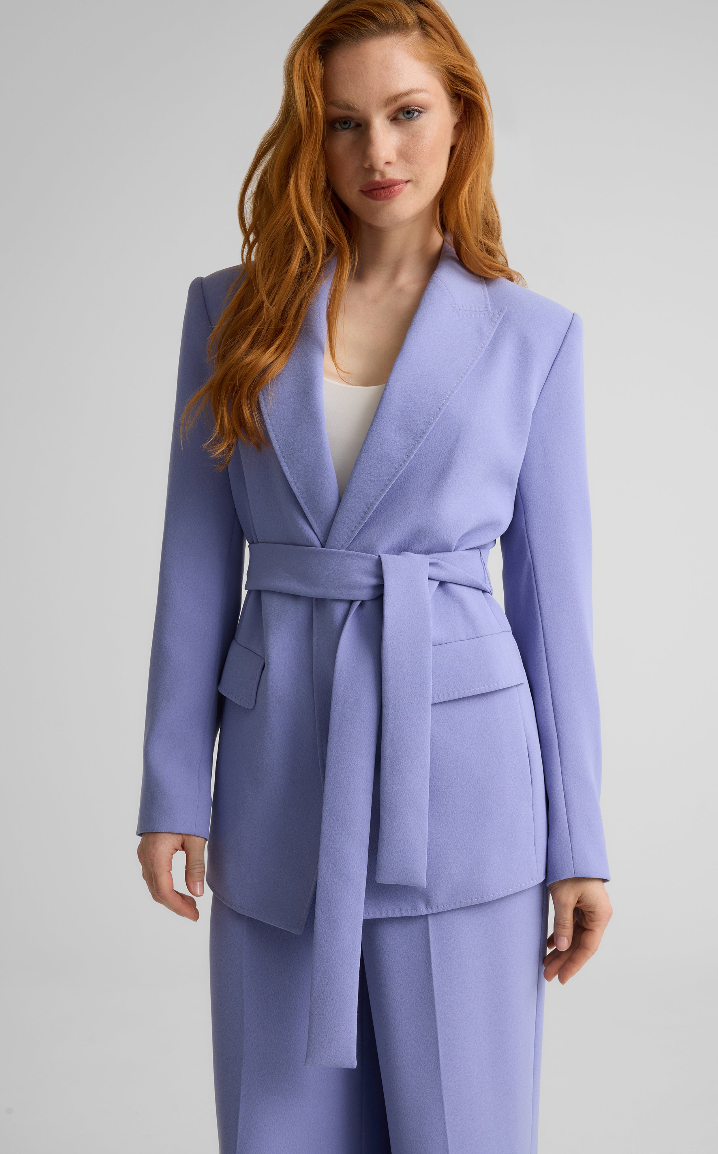 The Juliana puts a softer spin on traditional tailoring. Made from fluid Satin Back Crepe in soothing Iris to drape effortlessly on the body, this evening-ready jacket features a tie waist for the most flattering fit. Wear as a luxurious layer over formal dresses or pair with the matching Tabitha Pant for a graceful take on the tux.