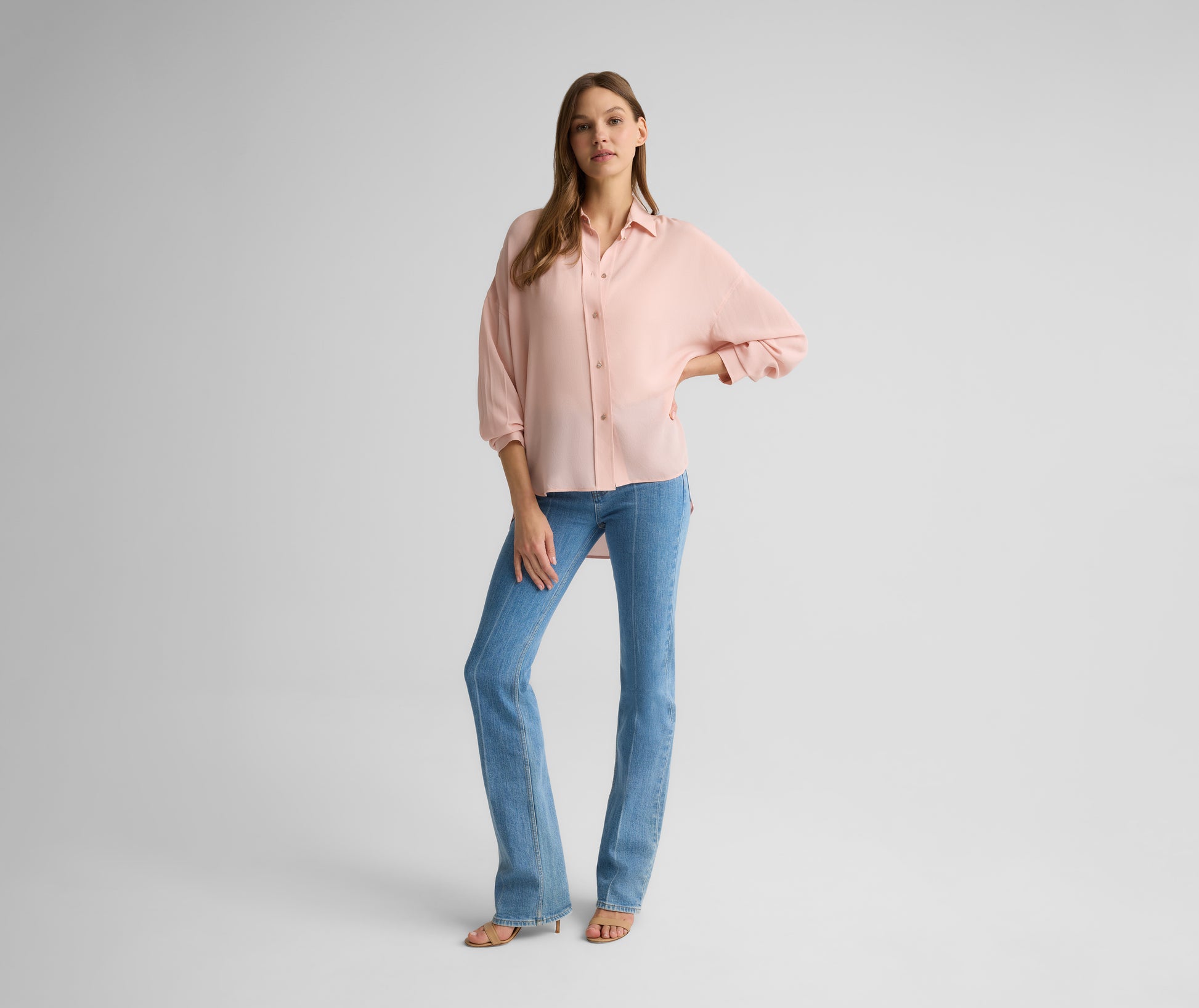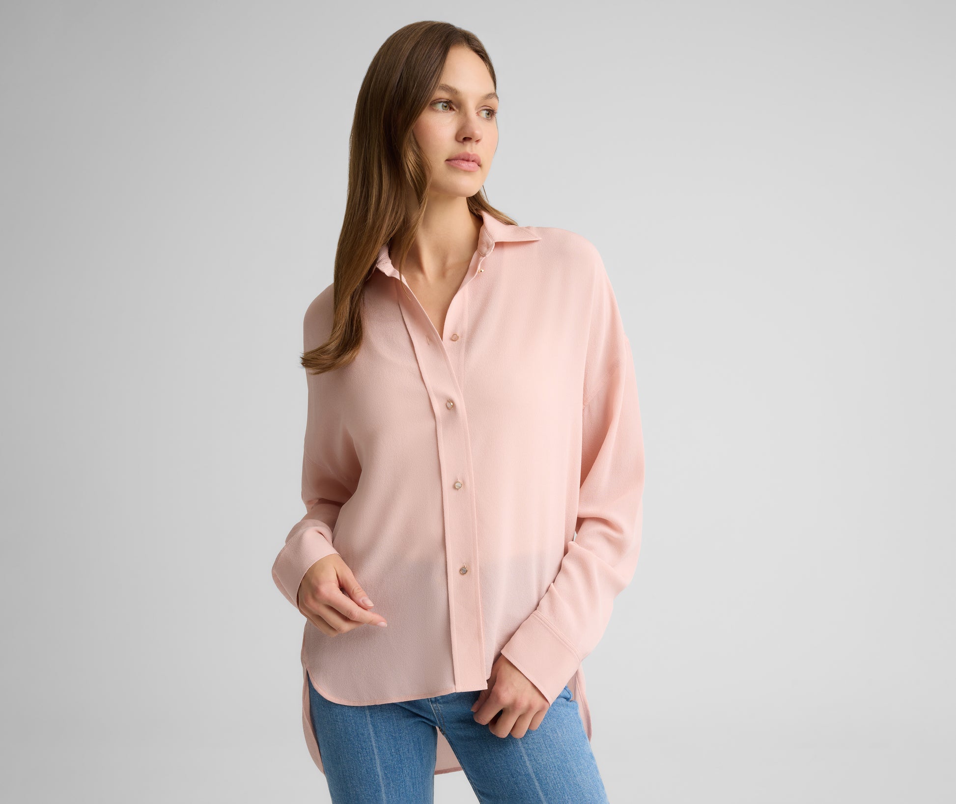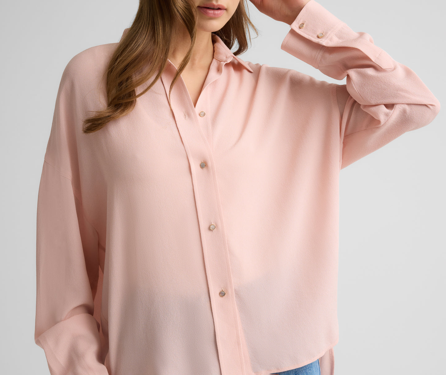 Equal parts relaxed and romantic, the Sharon elevates the classic button down with signature sophisticated details. Cut from fluid silk crepe in serene Rose Quartz, this airy, softly draped blouse is accented with gold-rimmed buttons for an added element of luxury.