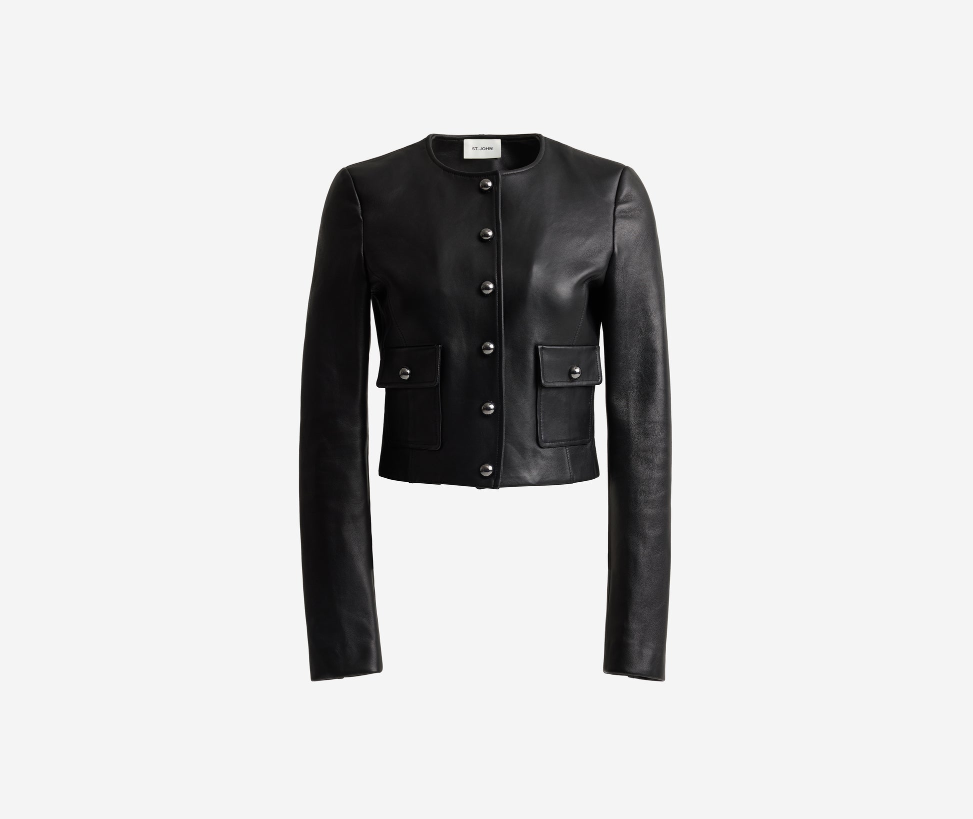 The Nadine reimagines the classic leather jacket through a refined lens. A clean silhouette meets an inherently edgy yet luxe material accented with sleek metal buttons, resulting in a bold layer that's both modern and timeless. Wear with the Leona Pant for a head-to-toe leather look, or over lace trimmed camisoles for a cool contrast.