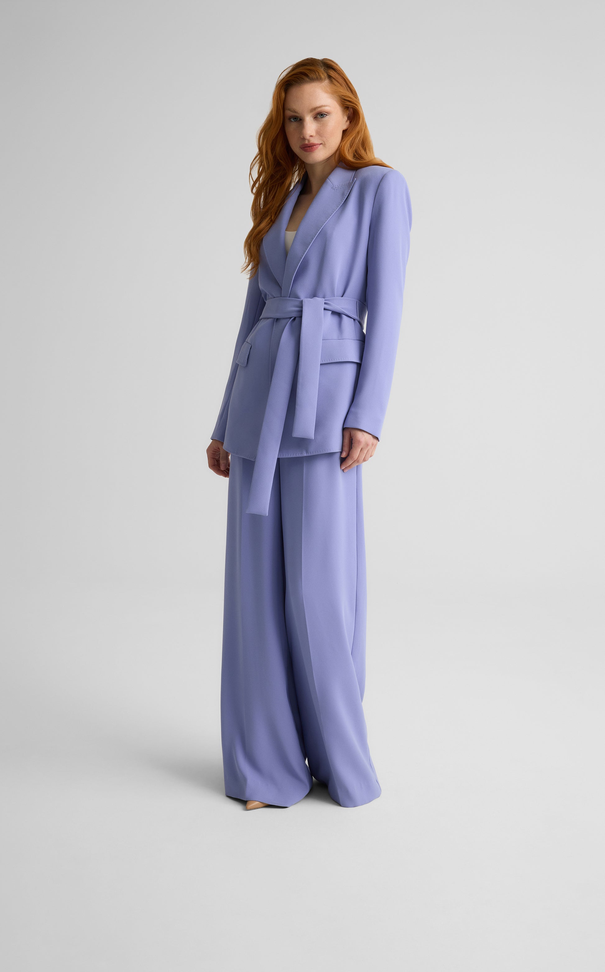 The Juliana puts a softer spin on traditional tailoring. Made from fluid Satin Back Crepe in soothing Iris to drape effortlessly on the body, this evening-ready jacket features a tie waist for the most flattering fit. Wear as a luxurious layer over formal dresses or pair with the matching Tabitha Pant for a graceful take on the tux.